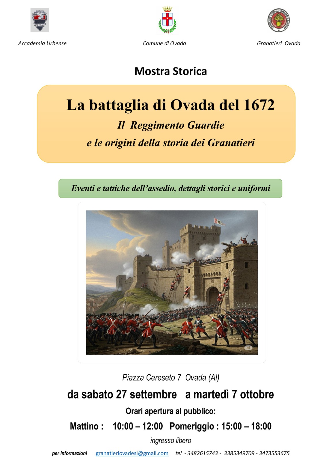 Eventi e tattiche dell'assedio, dettagli storici e uniformi. Presso Piazza Cereseto 7 Orario apertura al pubblico: Mattino: 10-12 Pomeriggio:15-18