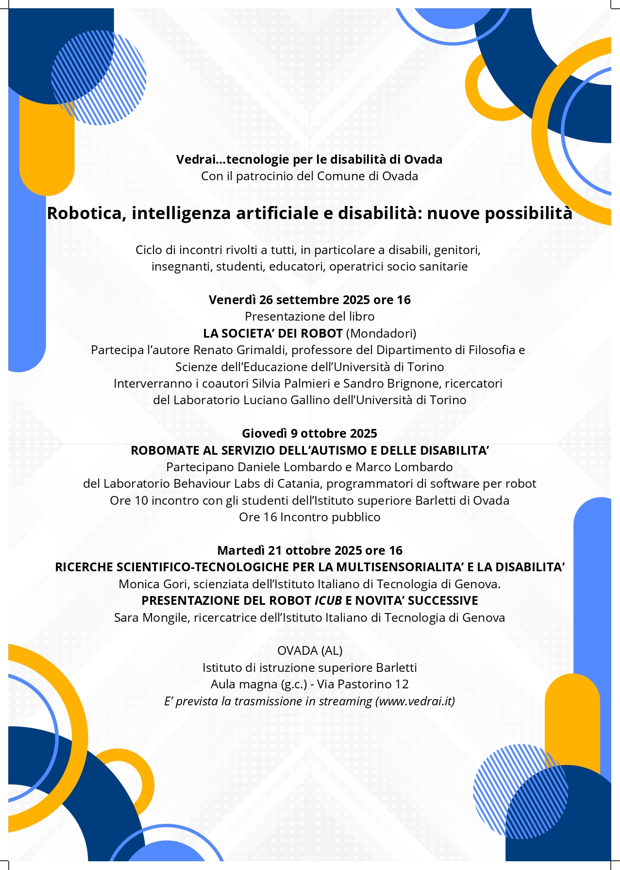 Presentazione del libro LA SOCIETA’ DEI ROBOT (Mondadori) Partecipa l’autore Renato Grimaldi, professore del Dipartimento di Filosofia e Scienze dell’Educazione dell’Università di Torino Interverranno i coautori Silvia Palmieri e Sandro […]