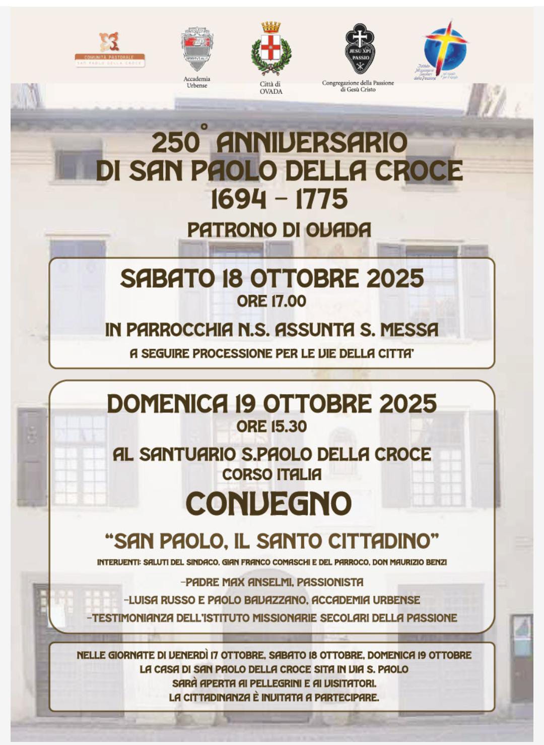 Sabato ore 17:00 in Parrocchia N.S. Assunta S. Messa a seguire processione Domenica ore 15:30 Convegno presso Santuario S. Paolo della Croce San Paolo il Santo Cittadino Venerdì, Sabato e […]