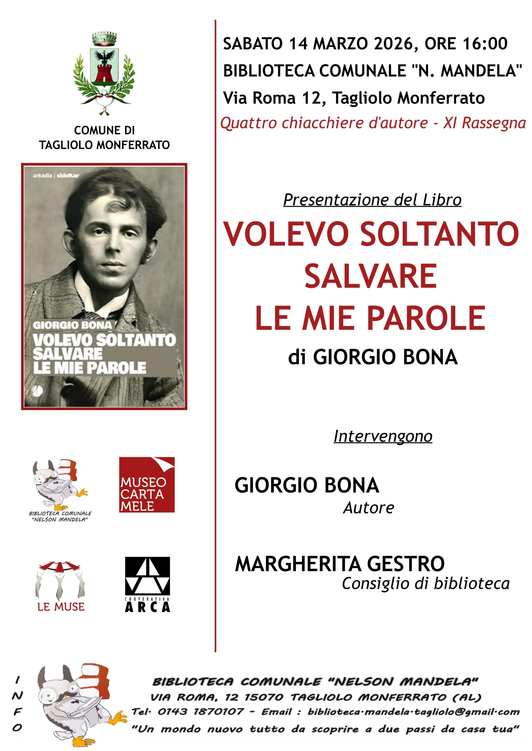 Presso la Biblioteca Comunale “Nelson Mandela” alle ore 16:00 Presentazione del libro “Volevo soltanto salvare le mie parole” di e con Giorgio Bona. Dialogherà con lui Margherita Gestro, Presidente del Consiglio di Biblioteca