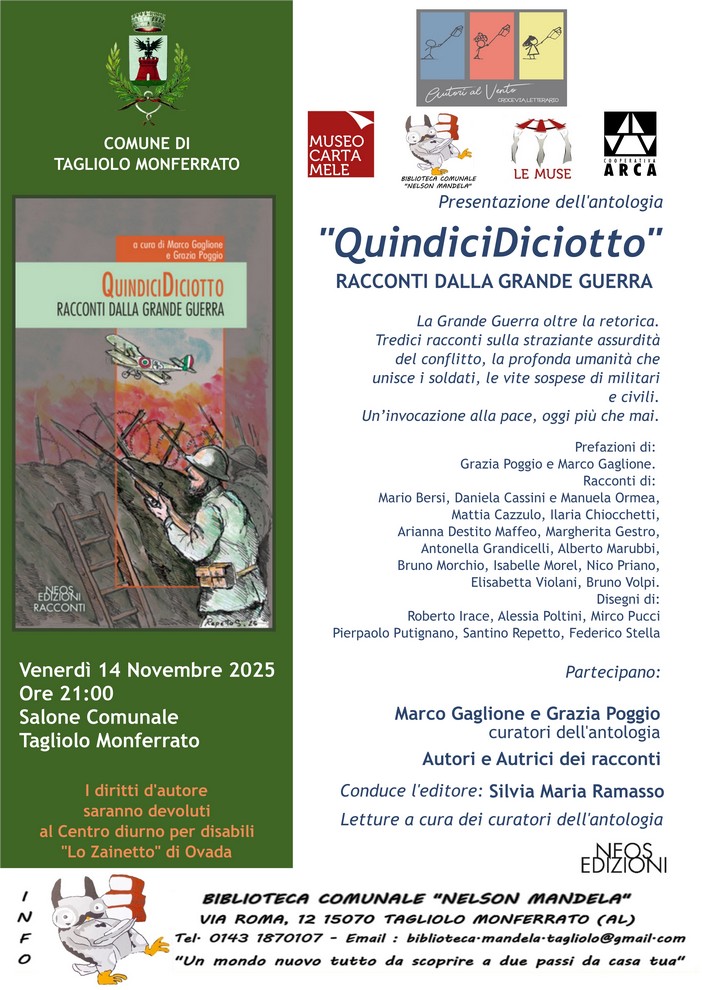 Verrà presentato il volume “QuindiciDiciotto. Racconti dalla Grande Guerra” a cura dei bibliotecari Marco Gaglione e Grazia Poggio.